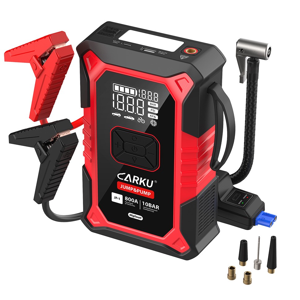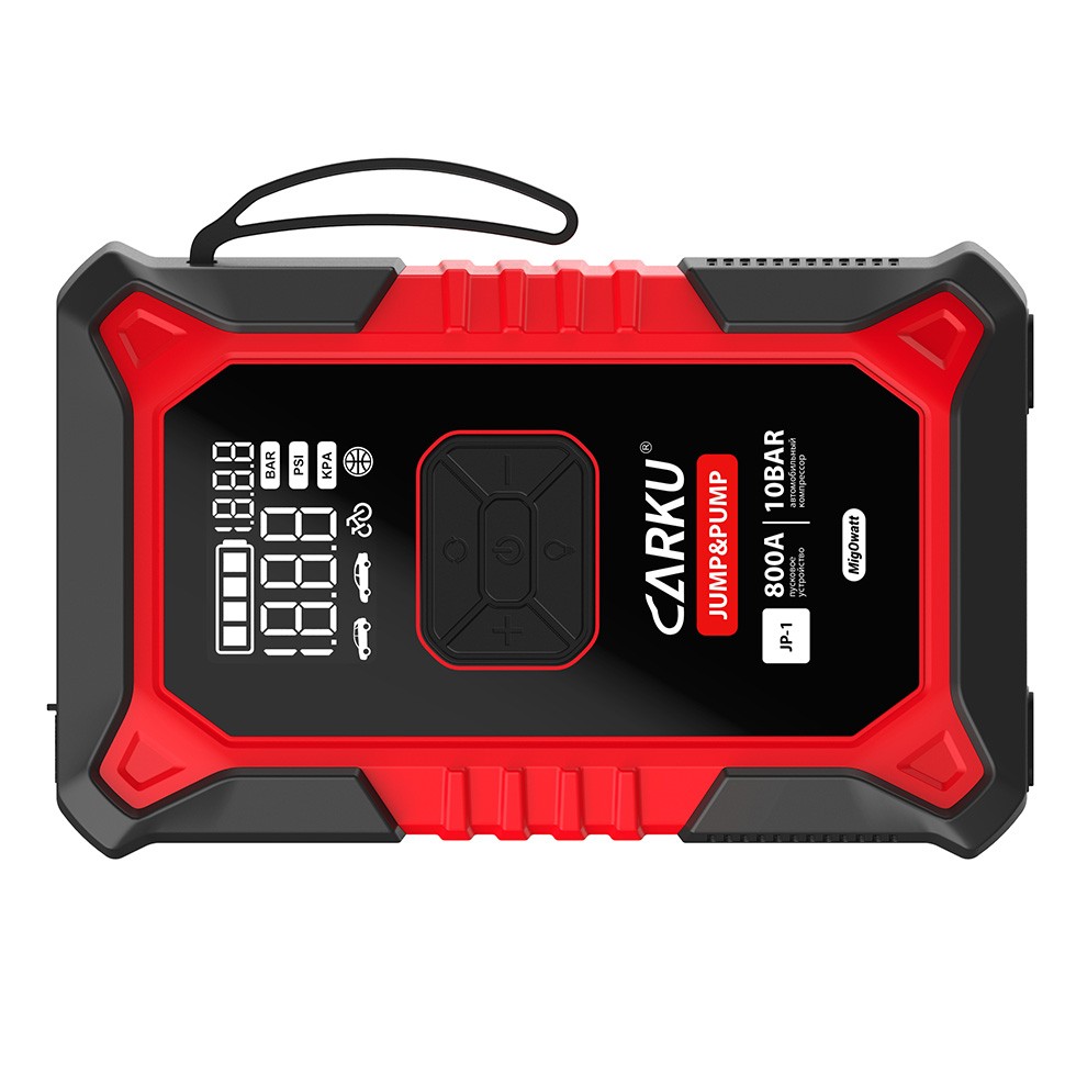 CARKU JP-1 (Jump&Pump) — пуско-зарядное устройство с автомобильным компрессором. Многофункциональная внешняя батарея поможет завести мотор вашей машины зимой при посаженном аккумуляторе, накачать колеса автомобиля, мотоцикла или футбольный мяч, а так же способна обеспечить полноценную зарядку электроники. Улучшенные пусковые характеристики, для еще большей уверенности при нештатных ситуациях.