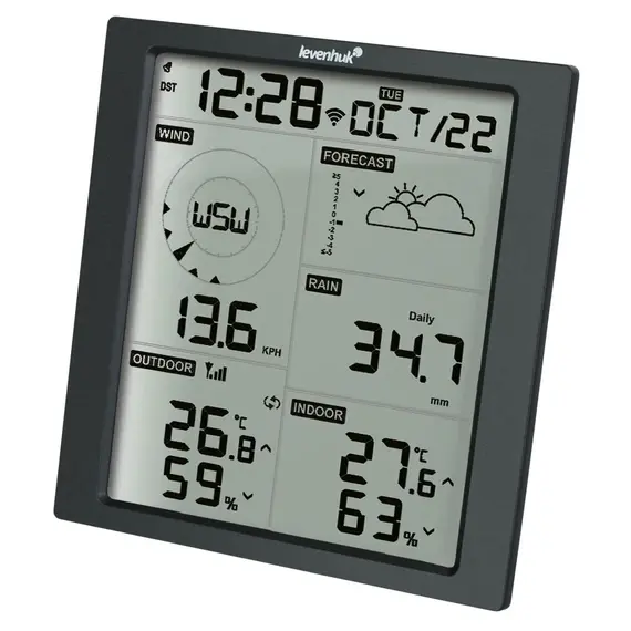 Метеостанция Levenhuk Wezzer PRO LP310 – это прибор профессионального уровня, который позволит с высокой точностью наблюдать и фиксировать погодные данные, а также температуру и уровень влажности в помещении. Он измеряет атмосферное давление, силу и скорость ветра, уровень выпавших осадков, информирует о точке росы и тепловом индексе. Кроме этого станция запоминает абсолютные минимумы и максимумы показаний и оповещает о высоких и низких показателях относительно референсов, установленных пользователем.