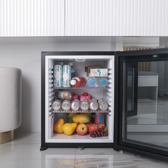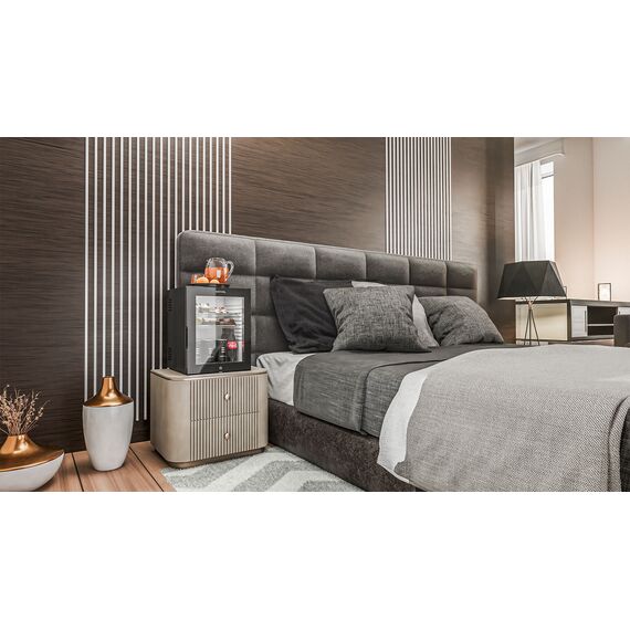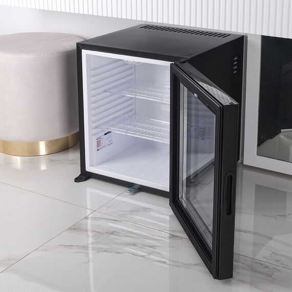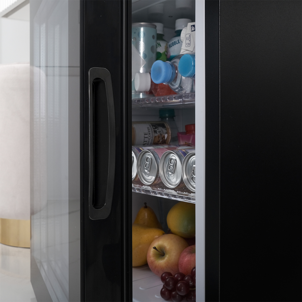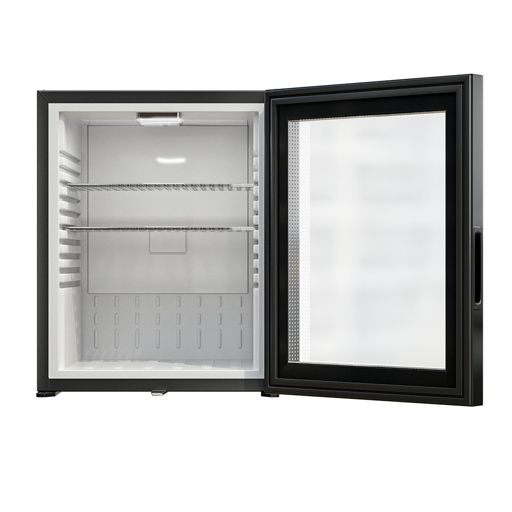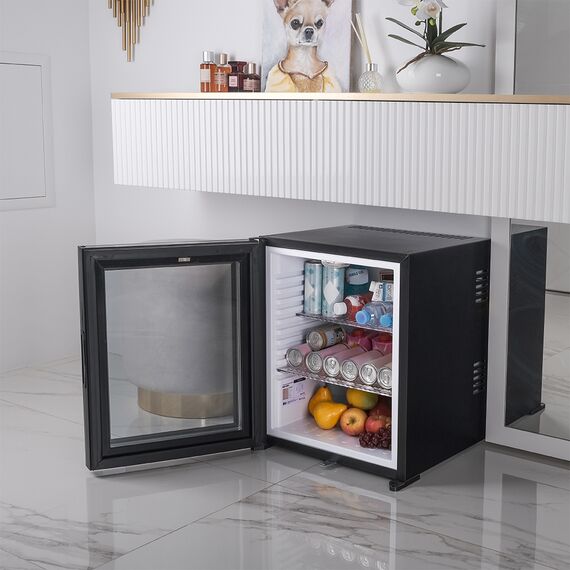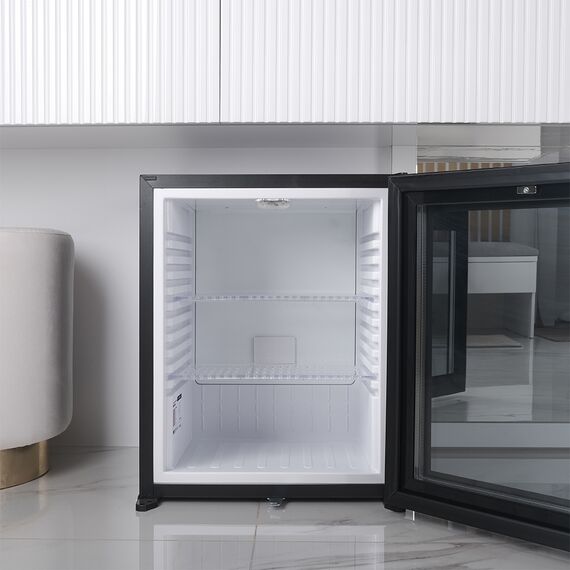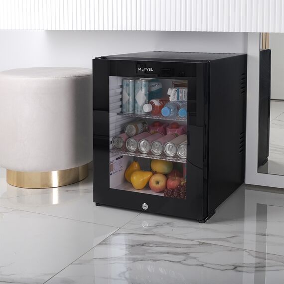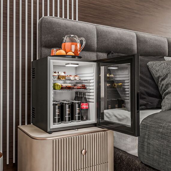 Дверца Meyvel MMT-38BG реверсивная, поэтому устройство адаптируется к конкретным условиям установки, и стеклянная, чтобы видеть содержимое без необходимости открывать мини-бар. Это удобно для гостей отеля или сотрудников офиса.