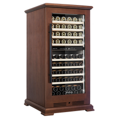 Компрессорный винный шкаф Meyvel MV99PRO-KBT2 (Тёмный шоколад) обладает большой вместимостью и способен разместить до 99 бутылок. Располагаются они на полках из массива бука. Внутреннее пространство шкафа разделено на 2 температурные зоны с возможностью настройки в диапазоне от + 5°C до +20°C. Холодильник поддерживает влажность в диапазоне 60-80%, как в настоящем винном погребе.