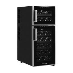 Компрессорный винный шкаф Meyvel MV28-KST2 обладает большой вместимостью и даёт возможность разместить до 28 бутылок стандартного типа Бордо (0,75 л). Располагаются они на выдвижных полках из дерева. Внутреннее пространство шкафа разделено на 2 температурные зоны, с возможностью настраивать каждую из них. Общий диапазон температуры у данной модели от +5°C до +20°C.
