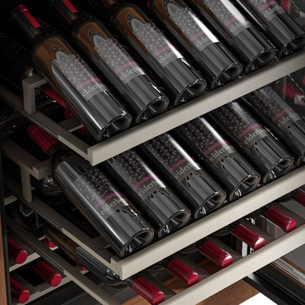 Для размещения винных бутылок, шкаф оснащен 13 специальными крепкими полками из массива бука: нижняя (1), универсальная (9), демонстрационная (2), полка с водным резервуаром (1). Для того, чтобы циркуляция воздуха была максимально качественной и равномерной, необходимо размещать бутылки с вином так, что бы они не соприкасались со стенкой испарителя.