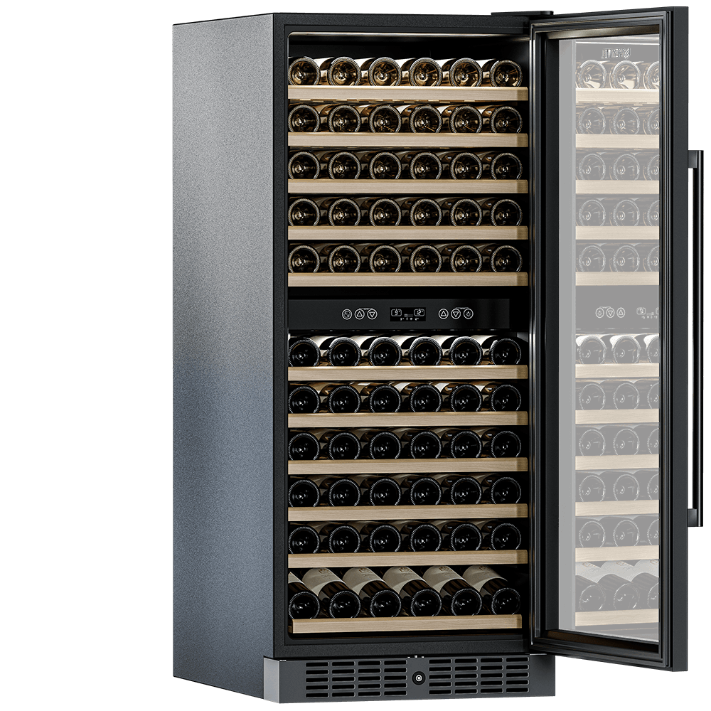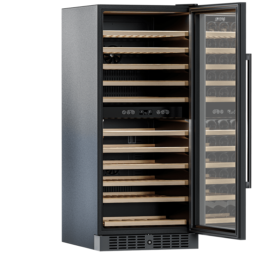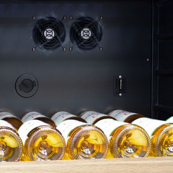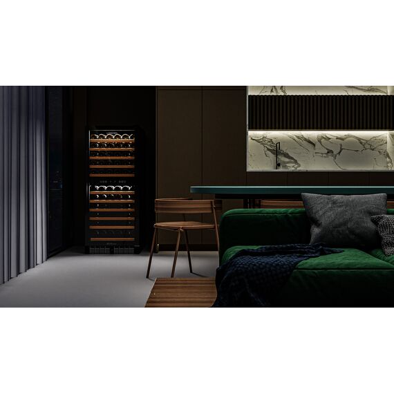 Компрессорный винный шкаф Meyvel MV116-KBT2 обладает большой вместимостью и способен разместить до 116 бутылок. Располагаются они на полках из массива бука. Внутреннее пространство шкафа разделено на 2 температурные зоны с возможностью настраивать каждую из них: диапазон нижней зоны от +10°C до +18°C, а верхней - от + 5°C до +10°C. Холодильник поддерживает влажность в диапазоне 60-80%, как в настоящем винном погребе.