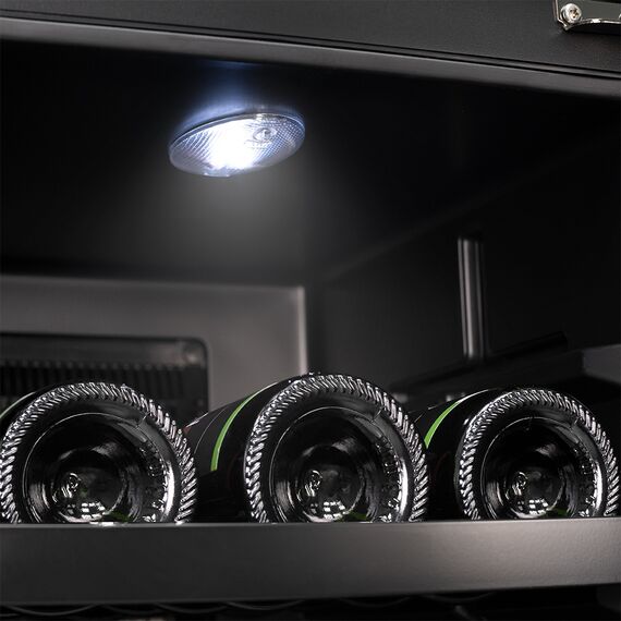 Двойное стекло с защитой от прямых УФ-лучей поддерживает качественные условия хранения вина. Для размещения винных бутылок, шкаф оснащен 4 полками из хромированного металла.