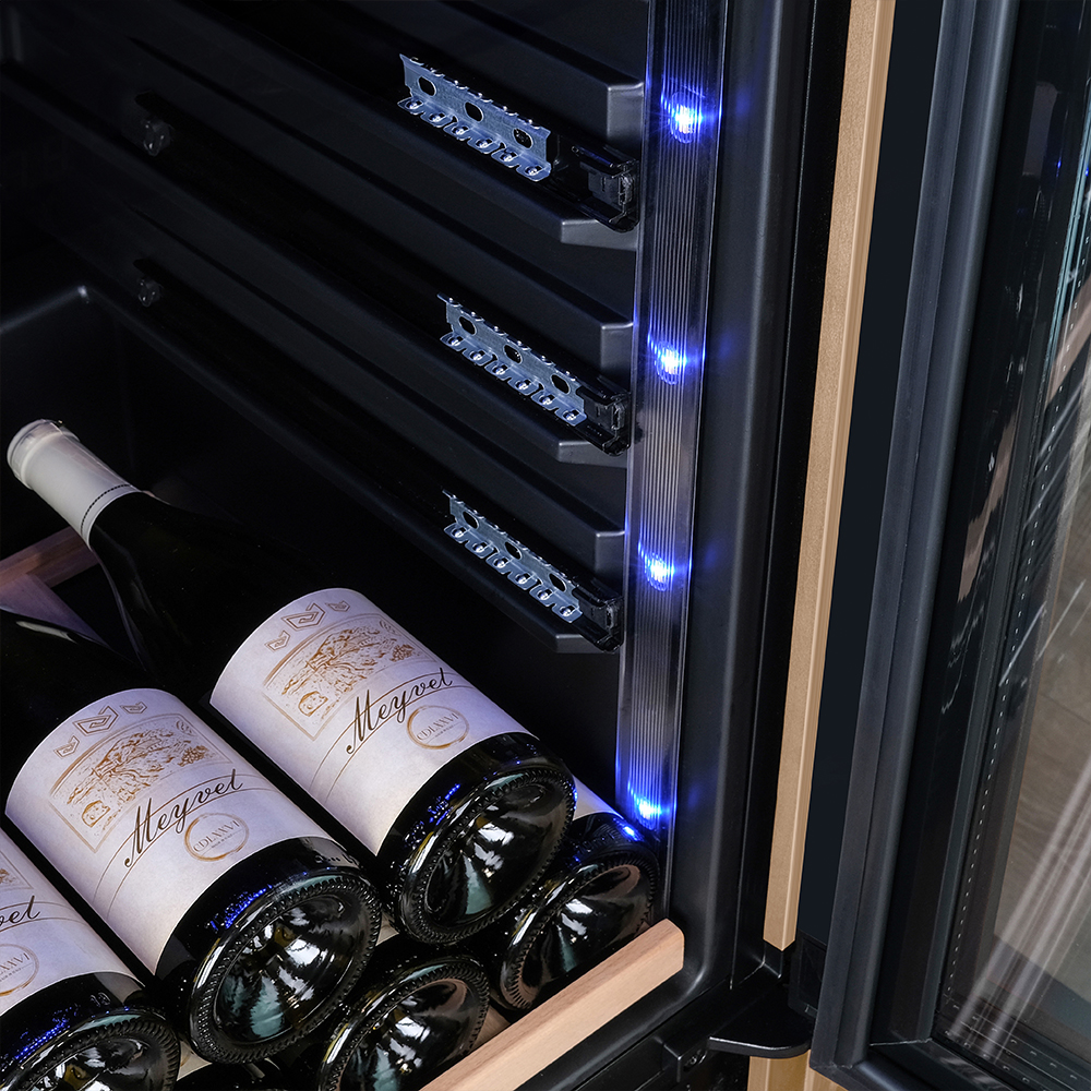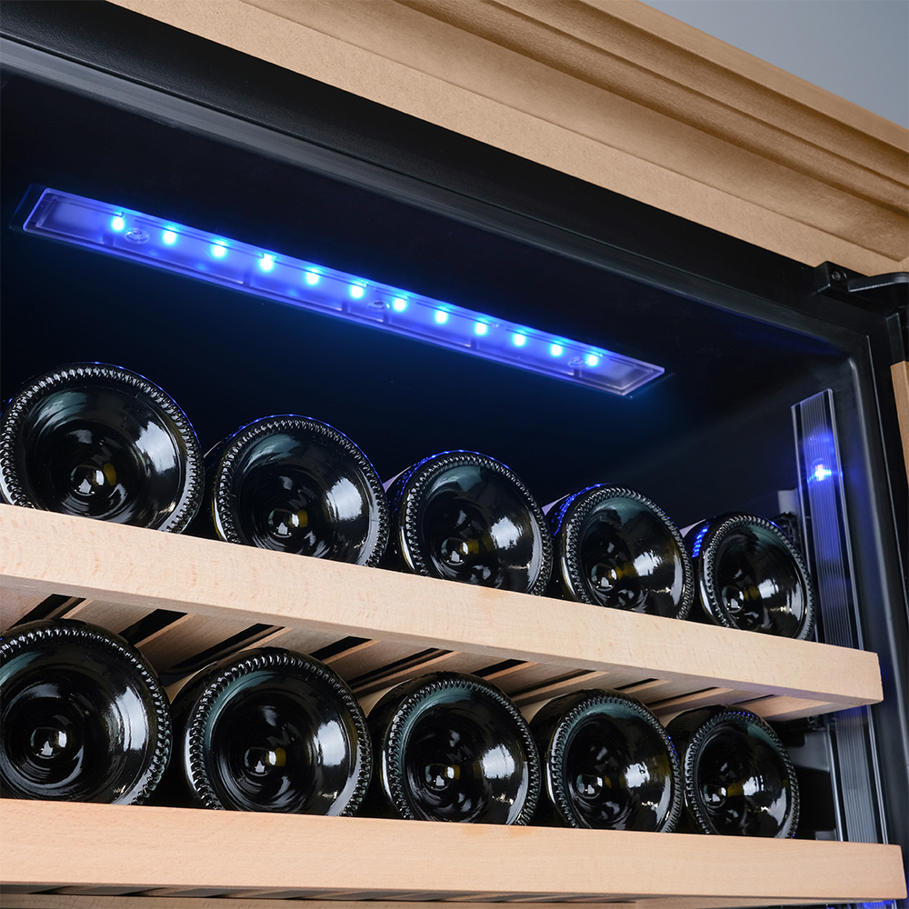 Несомненно, Вас порадует наличие панорамного светодиодного освещения (подсвечивает каждую полку), которое имеет три цвета - белый, янтарный и синий. Оно не выделяет тепло и следовательно - не нагревает бутылки с вином. Так что Вы сможете эффектно демонстрировать Вашу винную коллекцию.