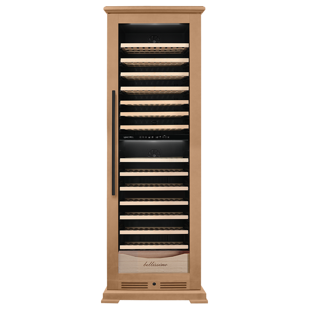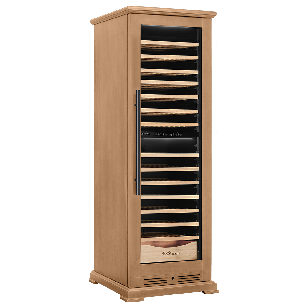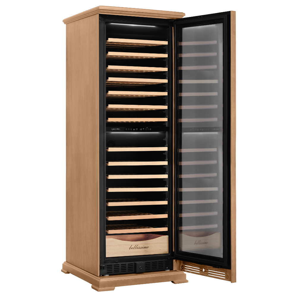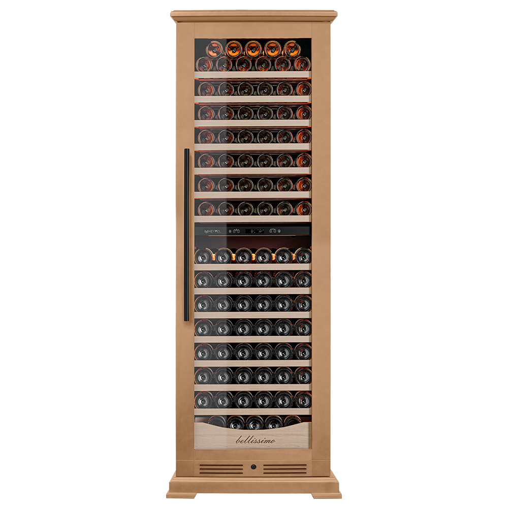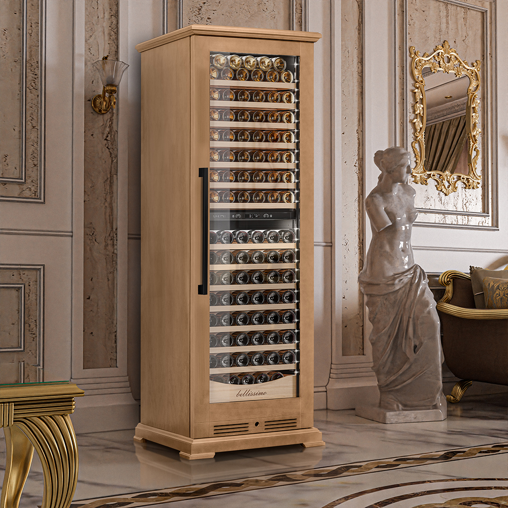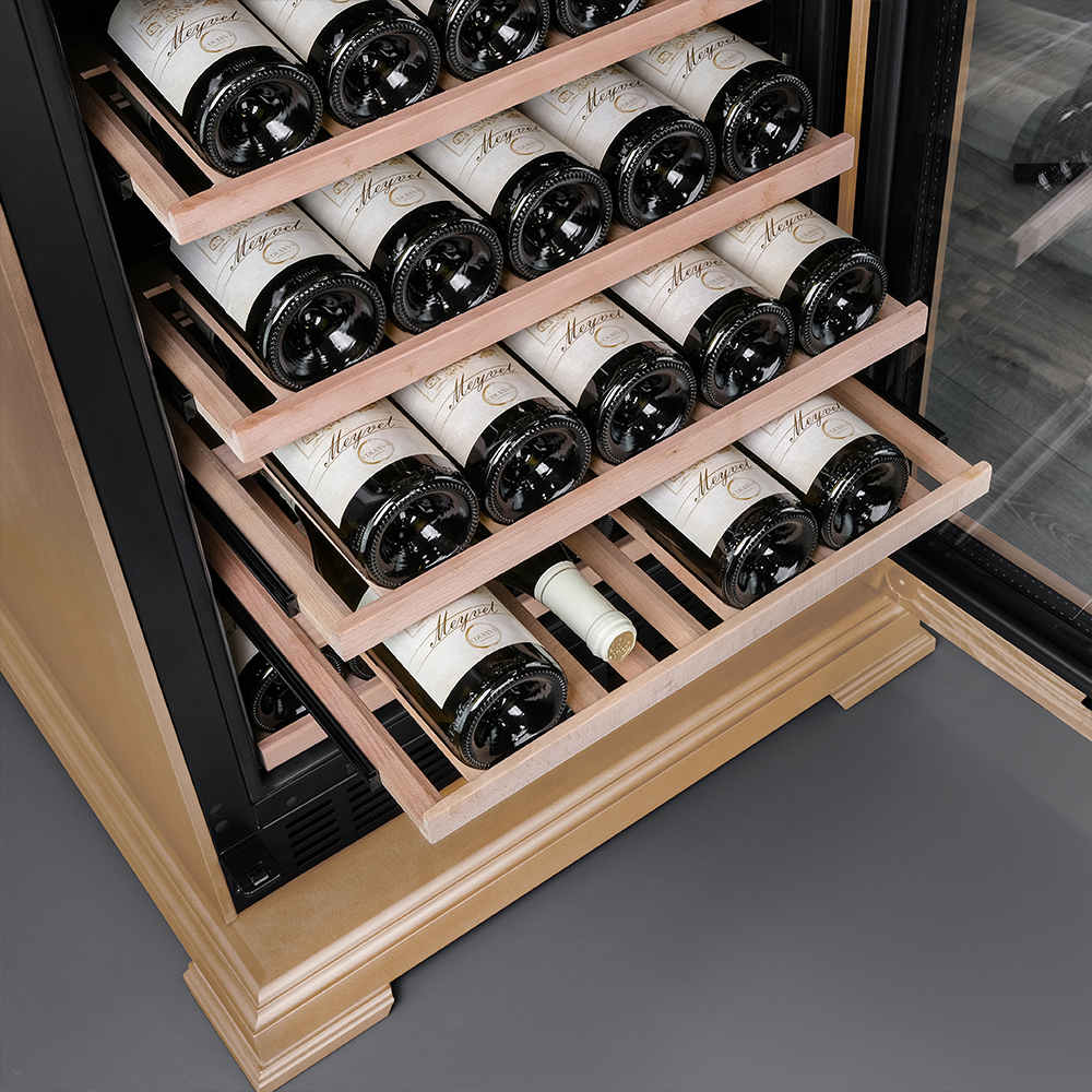 Винный шкаф предназначен для профессионального и длительного хранения различных сортов вин (до 174 бутылок типа Бордо). Он так же оснащен дверью с защитой от ультрафиолетовых лучей и поддерживает влажность в диапазоне 60-80%, как в настоящем винном погребе.