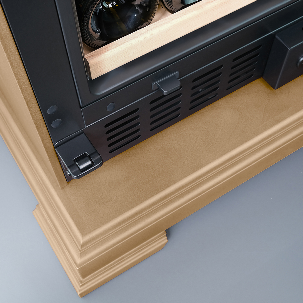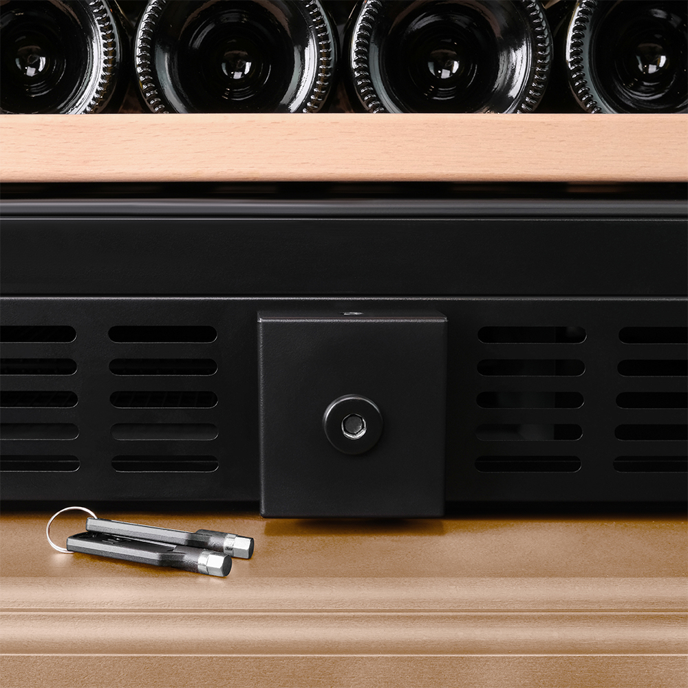 Винный холодильник оснащён надёжным и экономичным компрессором. Ручка, вентиляционная решётка и замок выполнены в цвете корпуса.
