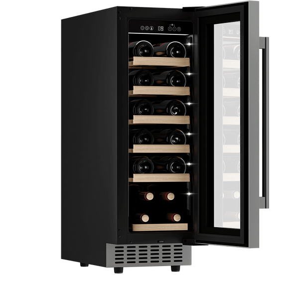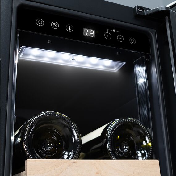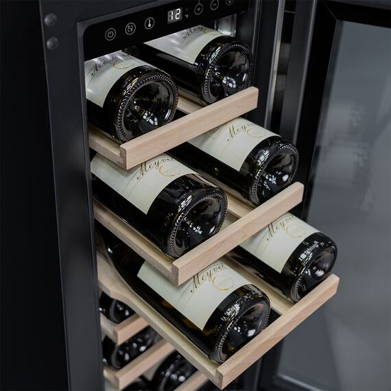 Компрессорный винный шкаф Meyvel MV19-KST1 обладает оптимальной вместимостью и даёт возможность разместить до 19 бутылок стандартного типа Бордо (0,75 л). Располагаются они на выдвижных полках из дерева. Внутреннее пространство шкафа поддерживает комфортную для вина температуру от +5°C до +20°C. Так же, эта модель поддерживает влажность в диапазоне 60-80%, как в настоящем винном погребе.