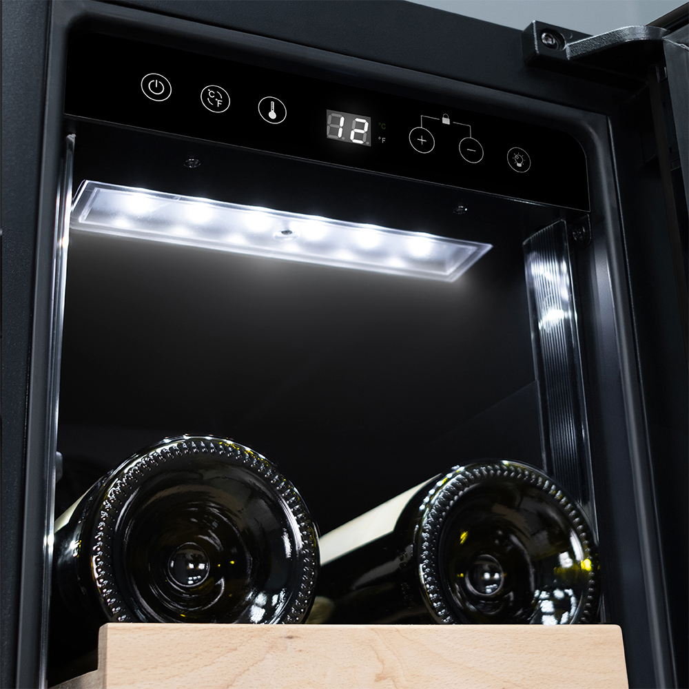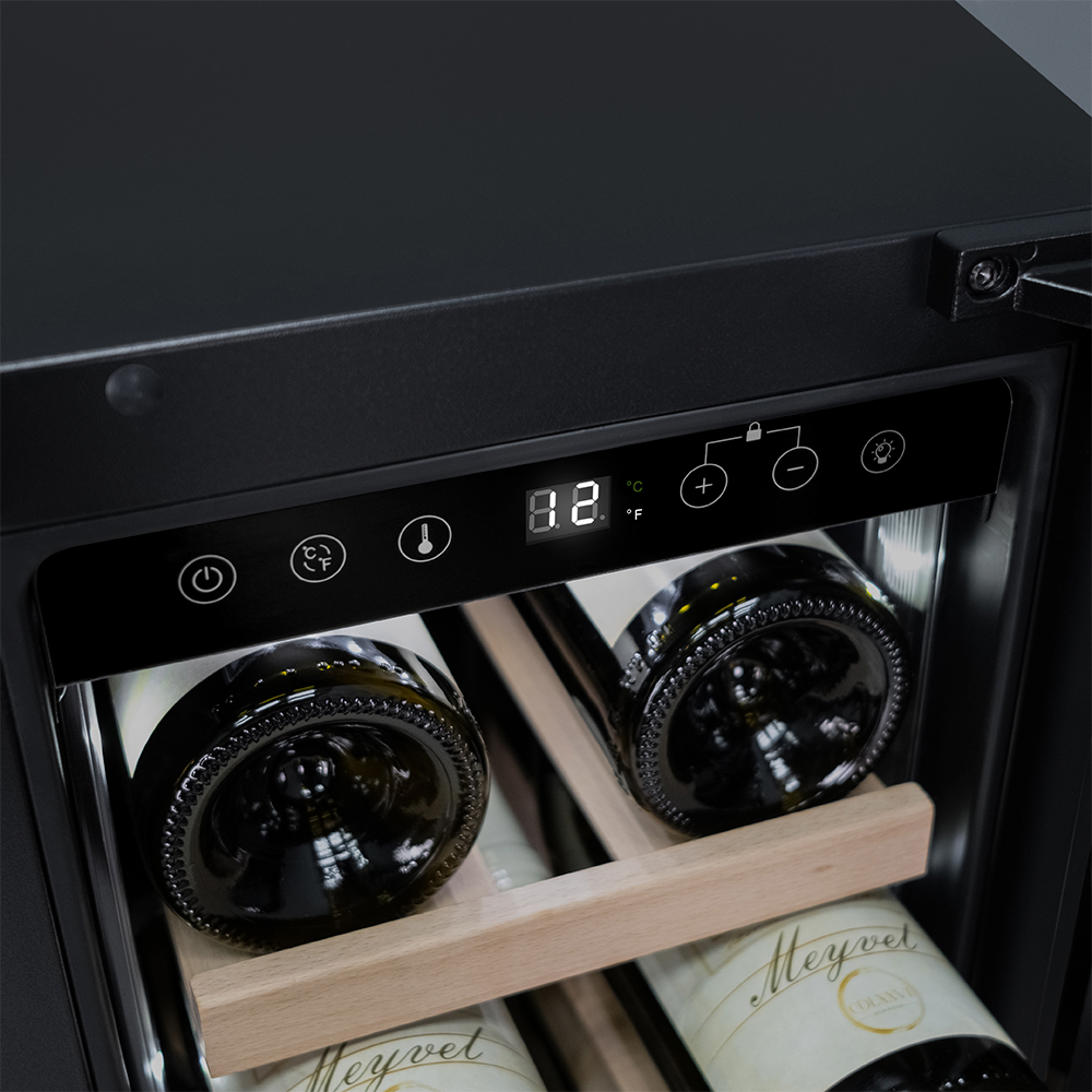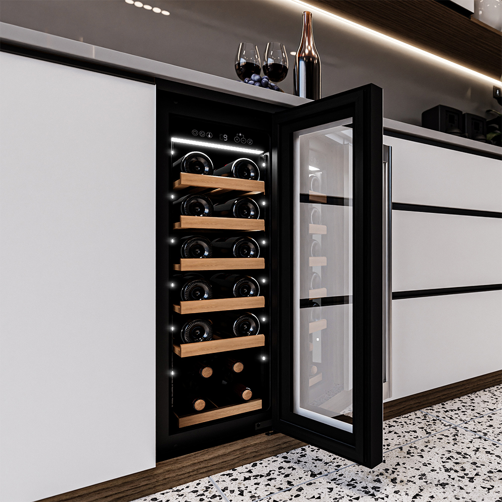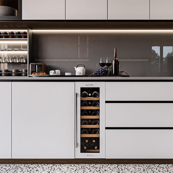 Компрессорный винный шкаф Meyvel MV19-KWT1 обладает оптимальной вместимостью и даёт возможность разместить до 19 бутылок стандартного типа Бордо (0,75 л). Располагаются они на выдвижных полках из дерева. Внутреннее пространство шкафа поддерживает комфортную для вина температуру от +5°C до +20°C. Так же, эта модель поддерживает влажность в диапазоне 60-80%, как в настоящем винном погребе.