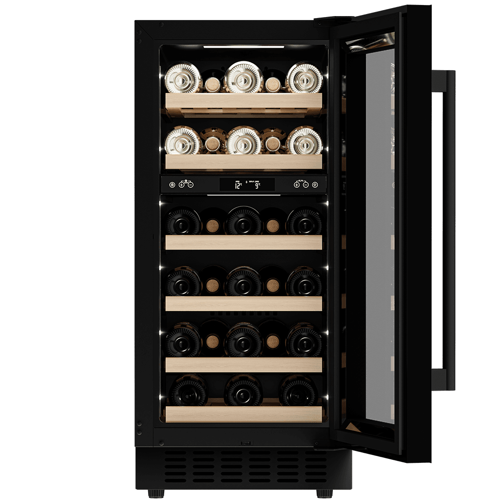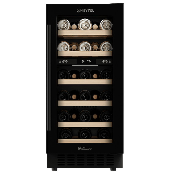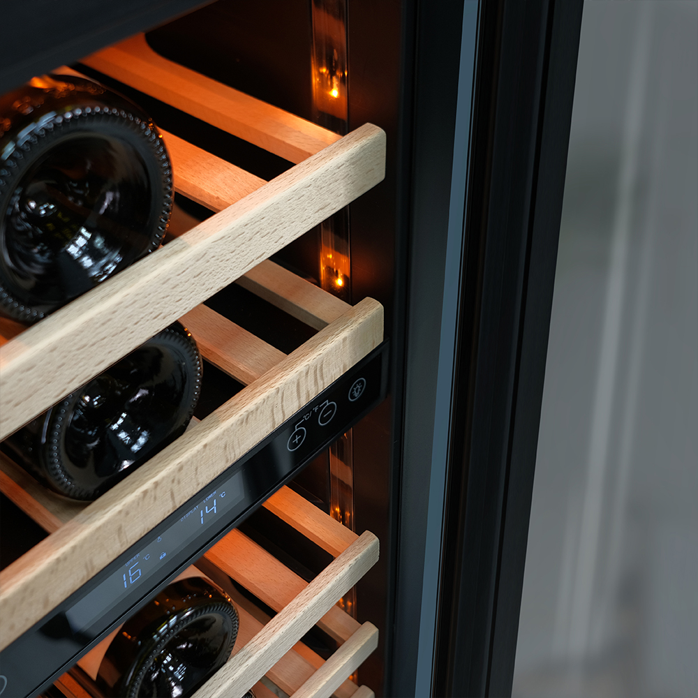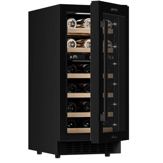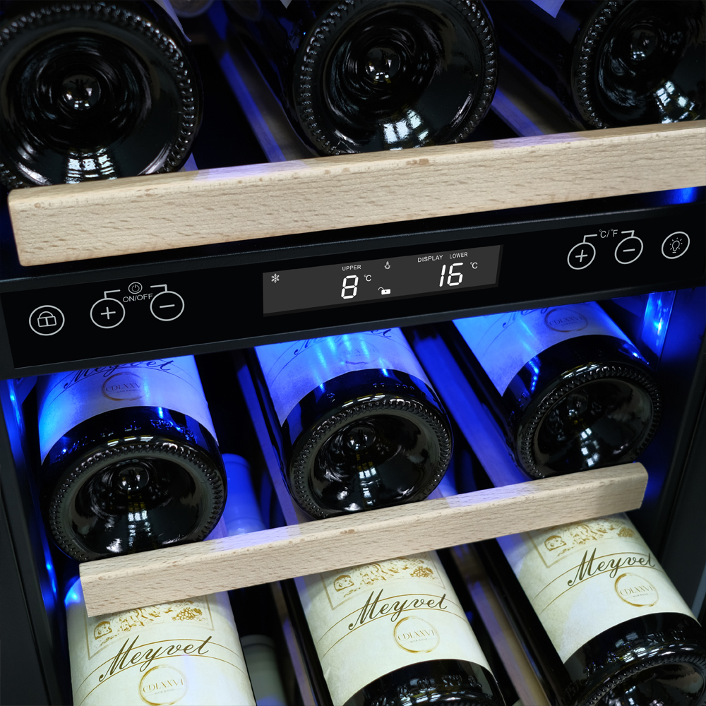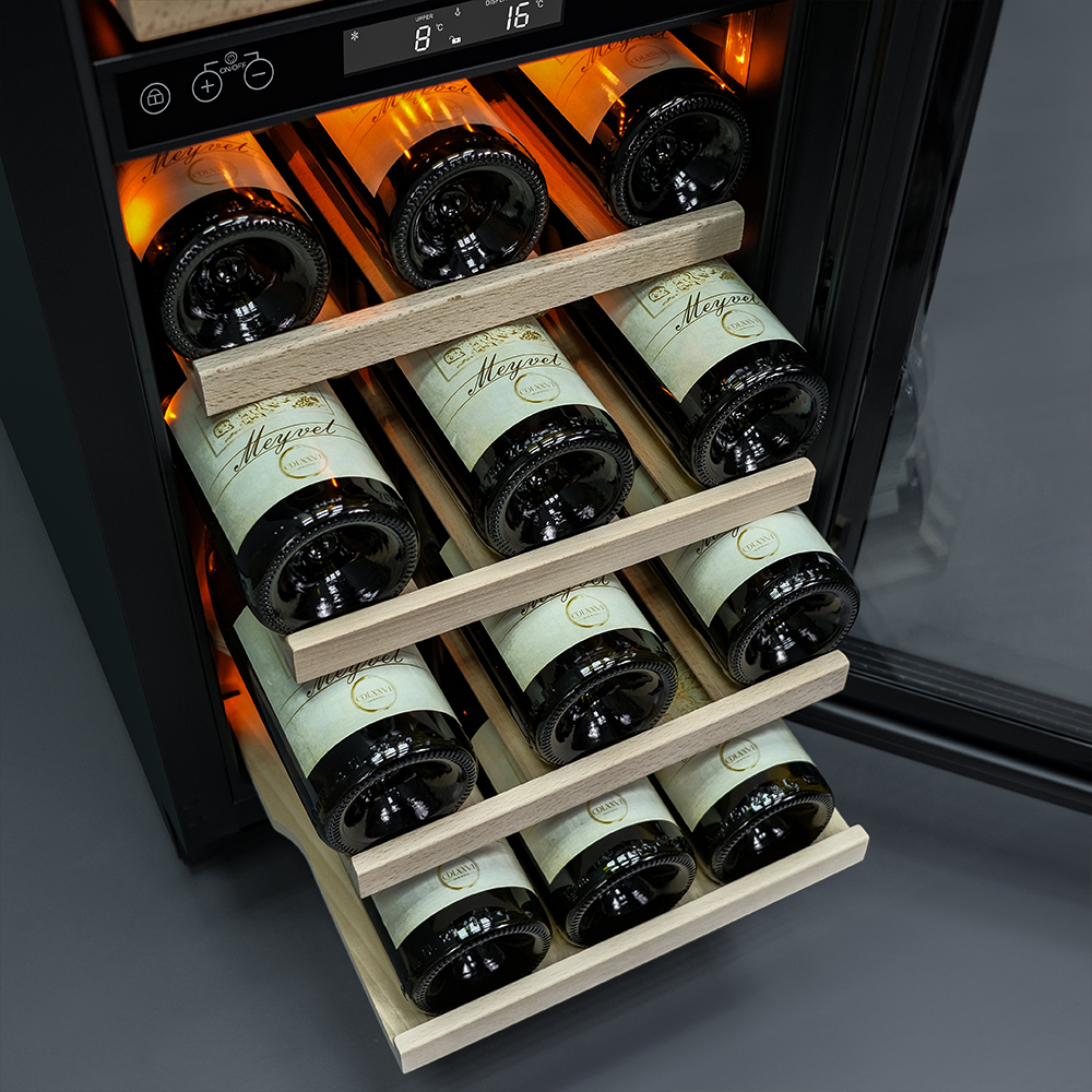 Компрессорный винный шкаф Meyvel MV28-KBT2 обладает большой вместимостью и даёт возможность разместить до 28 бутылок стандартного типа Бордо (0,75 л). Располагаются они на выдвижных полках из дерева. Внутреннее пространство шкафа разделено на 2 температурные зоны, с возможностью настраиваить каждую из них. Общий диапазон температуры у данной модели от +5°C до +20°C.