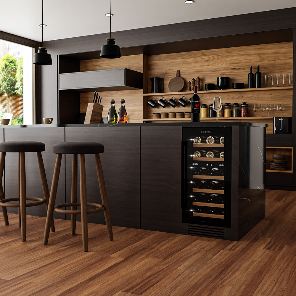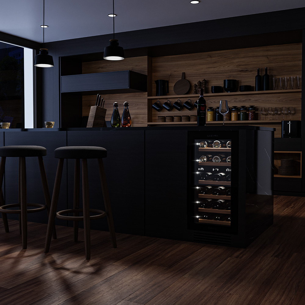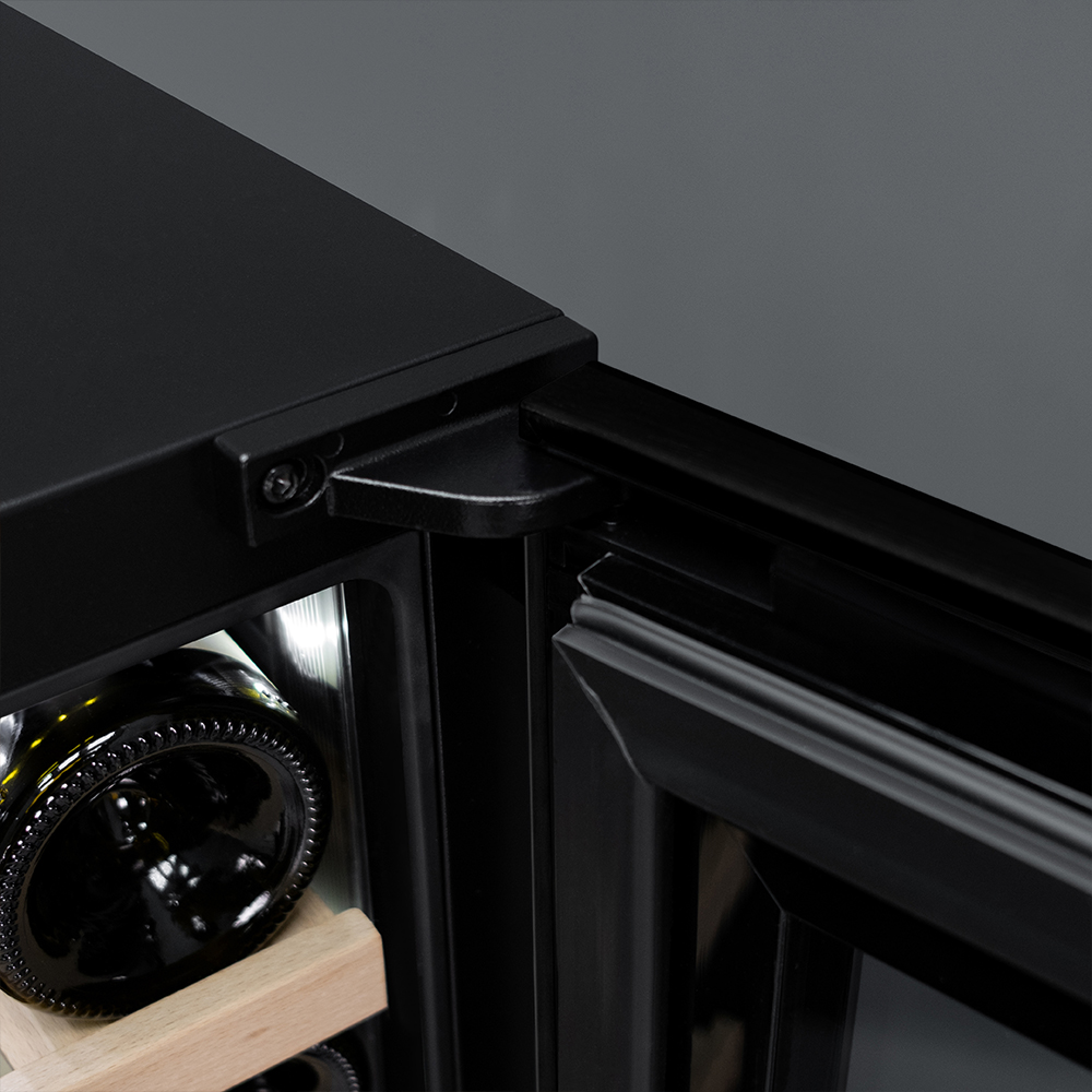 - необходимо установить винный шкаф по уровню и отрегулировать зазоры между дверью и мебельным фасадом, чтобы не повредить их.