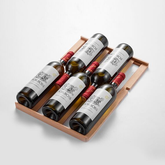 Для размещения винных бутылок, шкаф оснащен 7 крепкими полками из массива бука: выдвижные (5), выдвижные полуполки (2). Винные бутылки, расположенные внутри шкафа, надежно защищены от вредоносных ультрафиолетовых лучей двойным стеклом, установленным в дверцу.