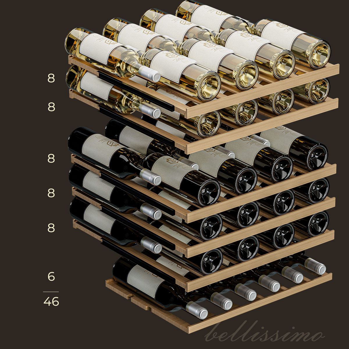 - Вместимость 46 бутылок стандартного типа Бордо (0,75 л);