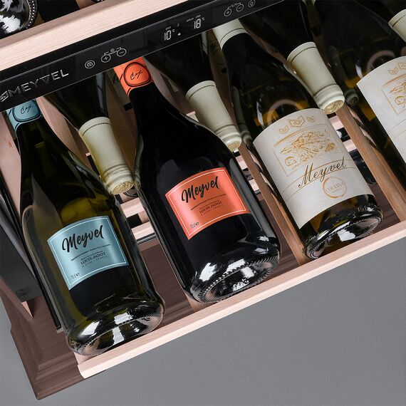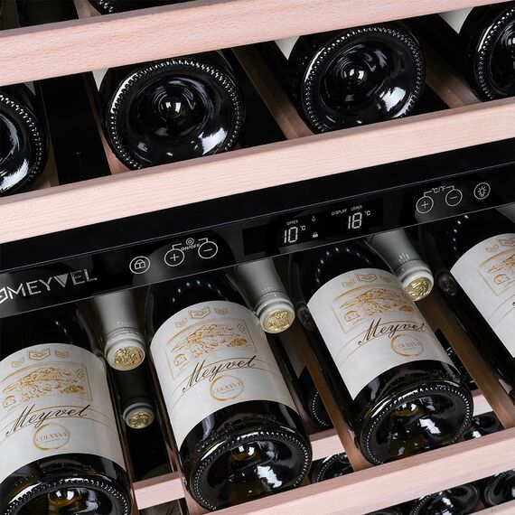 Компрессорный винный шкаф Meyvel MV46PRO-KBT2 (Итальянский орех) обладает большой вместимостью и даёт возможность разместить до 46 бутылок стандартного типа Бордо (0,75 л). Располагаются они на выкатных полках из дерева. Внутреннее пространство шкафа разделено на 2 температурные зоны, с возможностью настраивать каждую из них. Диапазон верхней зоны варьируется от +5°C до +12°C, а нижней - от +12°C до +20°C.