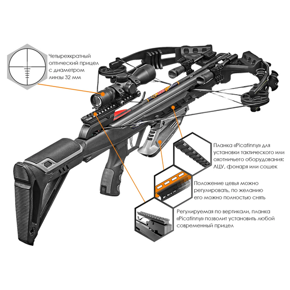 - Скорость вылета стрелы: 400fps (122 м/с)