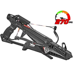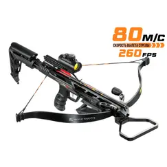 Скорость вылета стрелы: 270fps (82 м/с); Усилие натяжения: 40кг; Рабочий ход тетивы: 19,5см; Размах плеч невзведенных: 47,5см; Размах плеч взведенных: 40см; Общая длина: 54см; Вес: 2кг; Рекомендуемый стрелы: Двухперьевые 7,5” и 15”; Комплектация: Воск, защитные очки, стрела 7,5" (6шт.).