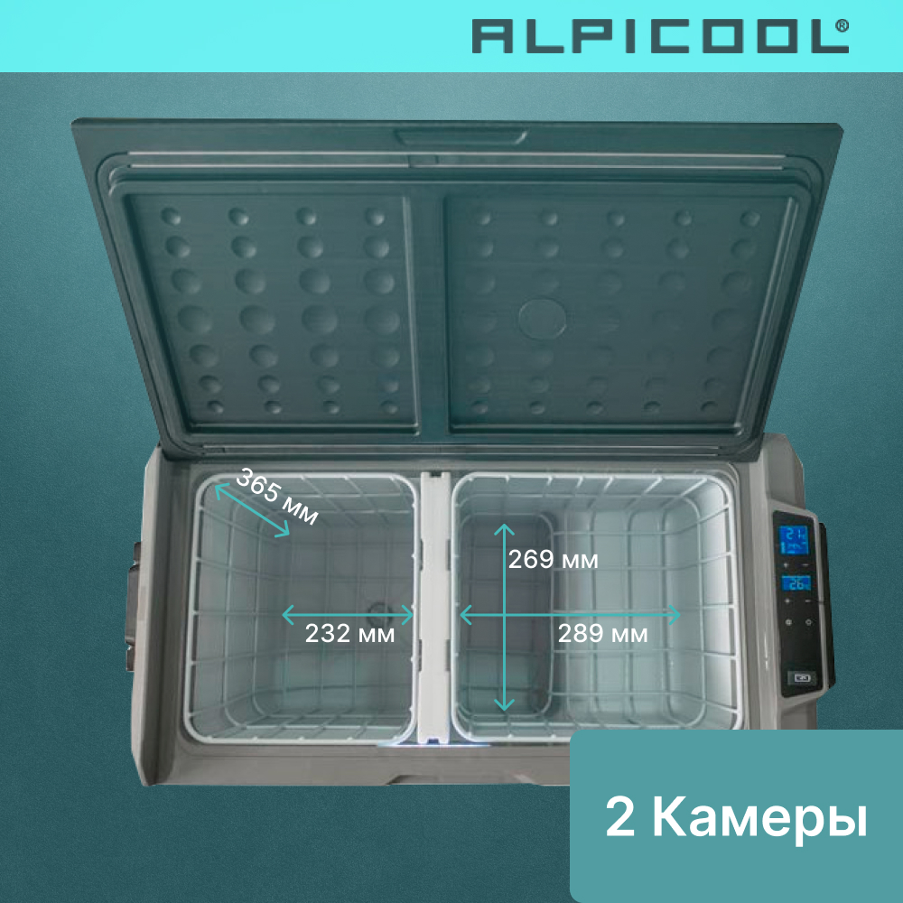 Внутреннее пространство данной модели представлено в виде просторного отсека, разделенного на две части, в каждой из которых Вы можете устанавливать необходимую температуру. Отсеки разделяет специальная перегородка, при изъятии которой, внутри холодильника образуется единый температурный режим. Вы можете с легкостью разместить достаточно большое количество продуктов и ёмкостей с напитками внутри каждого отделения. При открытии автохолодильника срабатывает датчик, за счет чего сразу же включается внутреннее освещение, равномерно распределяющее свет на оба отсека (даже при выключенном питании). Данная модель может работать в трех режимах: охлаждение, заморозка и глубокая заморозка.