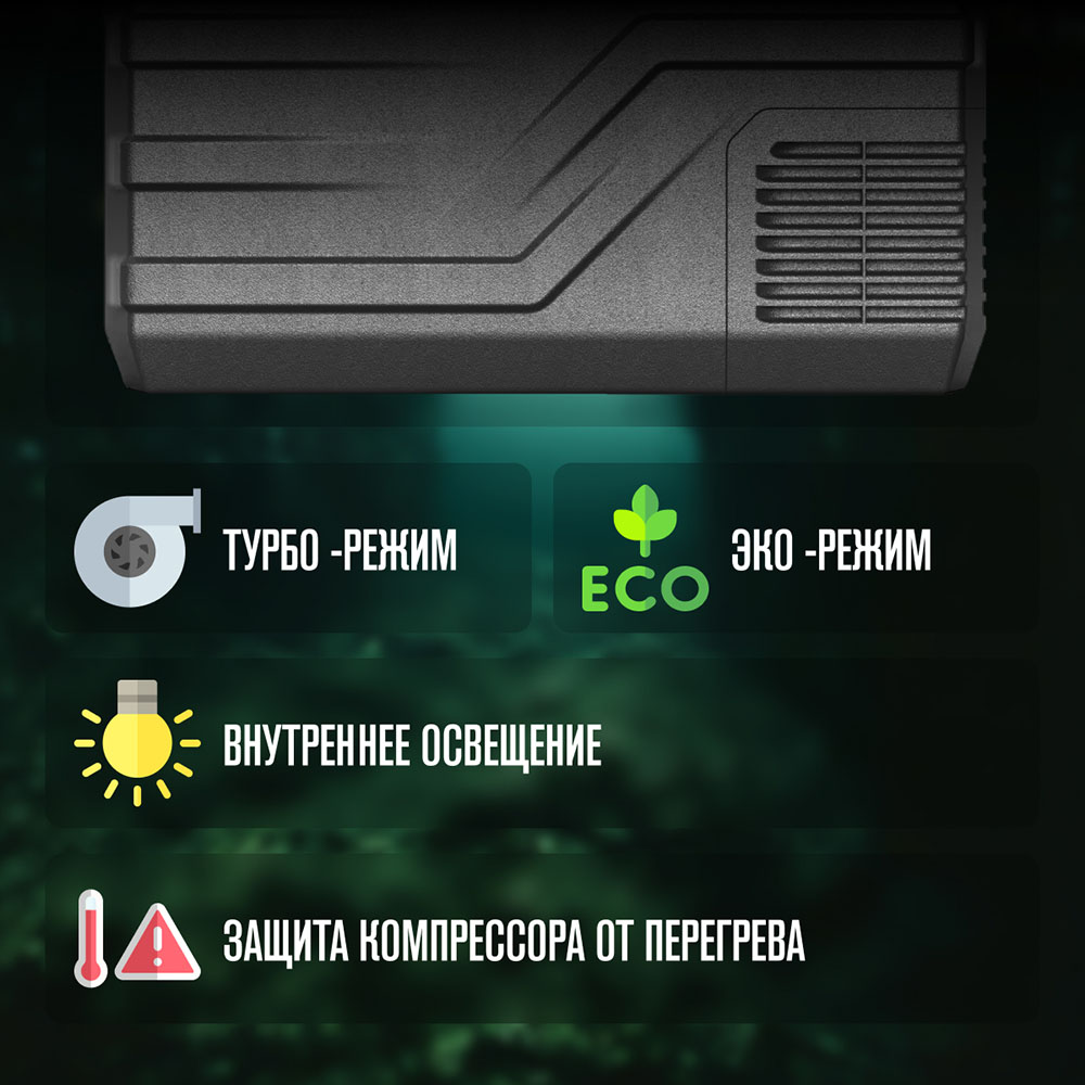 Высокопроизводительный компрессор, работающий от бортовой сети 12/24 В, поддерживает температурный диапазон от +20 до -20 °C. Чтобы быстро заморозить содержимое можно включить режим MAX, при котором аппарат функционирует на максимальной мощности, а функция ECO направлена на экономичный расход энергии.