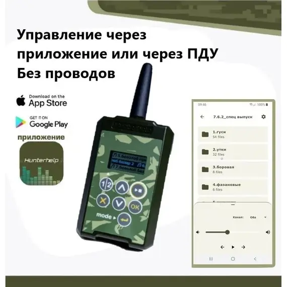 Управляйте охотой со смартфона! HunterHelp — это современный электронный манок со встроенным мощным динамиком на 25 Вт, который полностью подчиняется вашему телефону.