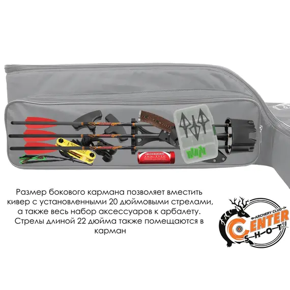 Сбоку предусмотрен вместительный карман для хранения аксессуаров и стрел. Высота задней части чехла, куда входит корпус и приклад арбалета, составляет 25 см, что позволяет вмещать в чехол арбалет с установленным прицельным приспособлением.