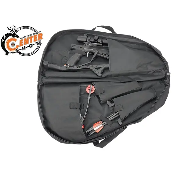 Имеется маленький карман для винтов и крепежных элементов. Чехол очень вместителен, но при этом удивительно компактен. Внешние стенки чехла имеют дополнительное уплотнение, гарантирующее сохранность арбалета при перевозке. Снаружи чехла располагается система креплений MOLLE. Предусмотрен ремень для ношения чехла на плече.