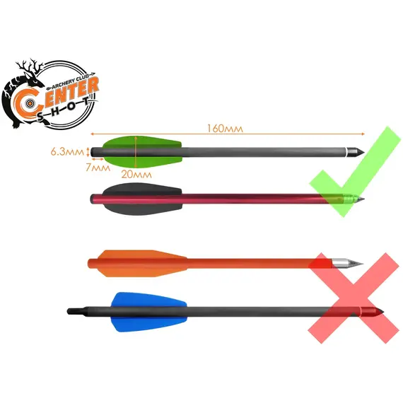 Стандарт стрел: Двухперьевые дротики - Ø 6.3 мм; длина 160 мм