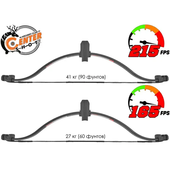 Скорость вылета стрелы: 215 футов в секунду (65 м/с) / 165 футов в секунду (50 м/с)