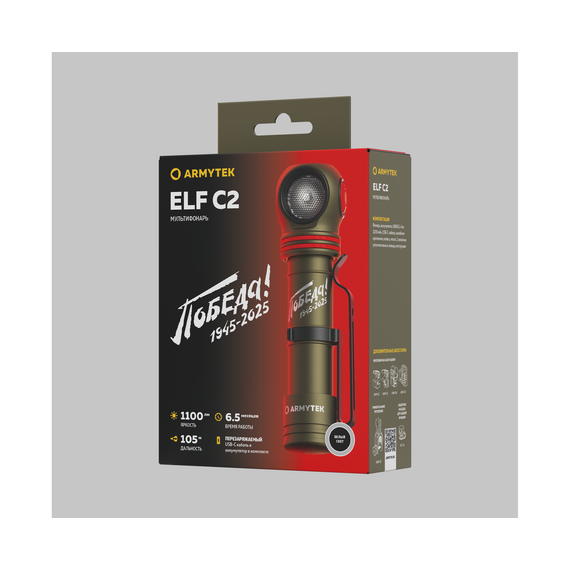 Armytek Elf C2 Pobeda — это лимитированная версия фонаря с уникальным дизайном. Готовый набор с аккумулятором, мощностью 1300 лм, защитой IP68 и зарядкой USB-C. Идеален для повседневного использования, туризма и коллекционирования.