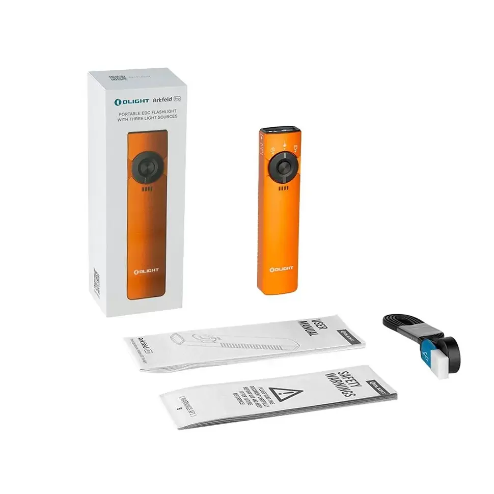 Ручной EDC фонарь Olight Arkfeld Pro Class 3R с дополнительным ультрафиолетовым светодиодом 365 nm мощностью 5 mW зеленым лазерным целеуказателем. Основной светодиод белого света Osram P9 мощностью светового потока 1300 люмен и дальностью 102 метра. Arkfeld Pro питается от встроенного li-po аккумулятора емкостью 1500 mAh, который заряжается магнитным кабелем Olight MCC от USB выхода.