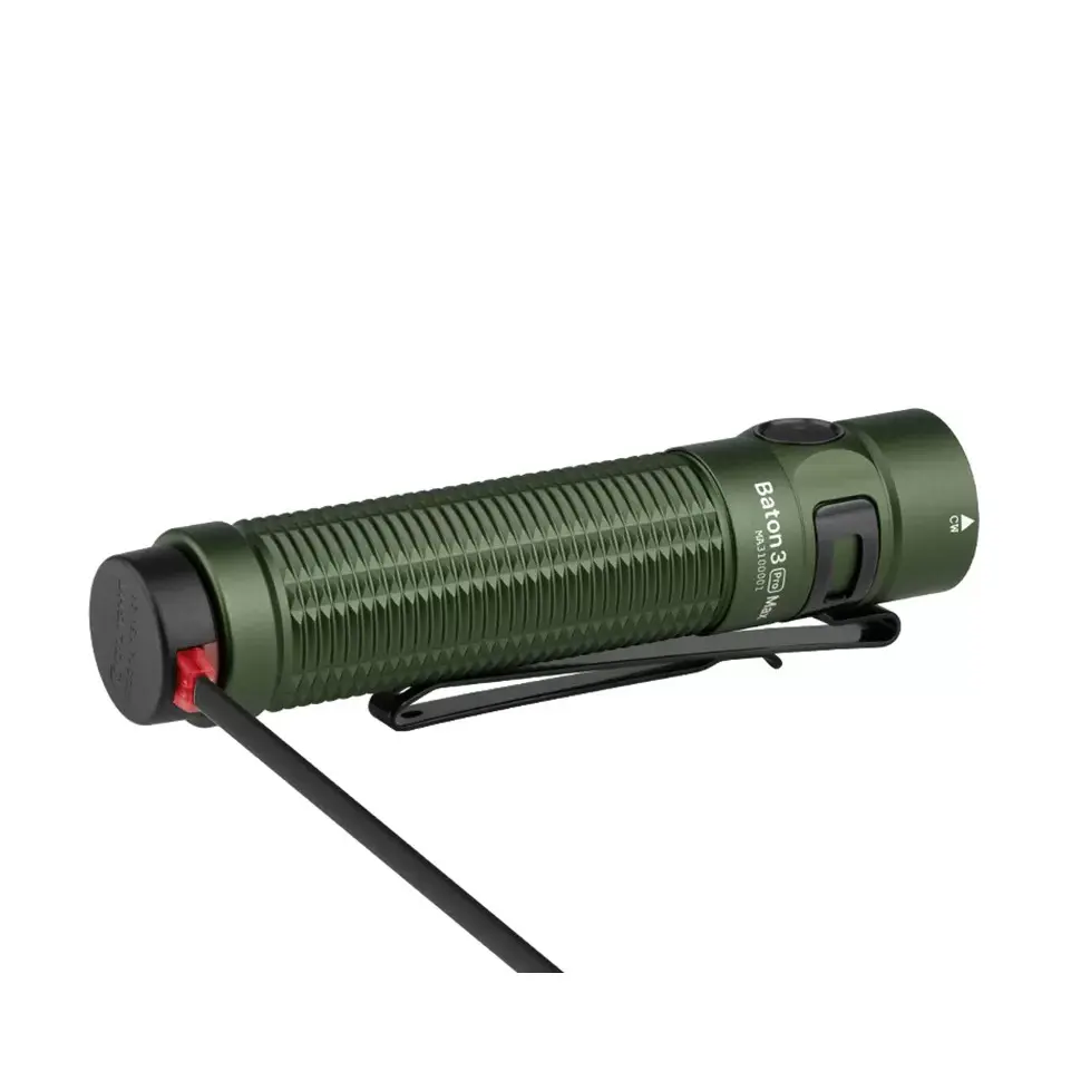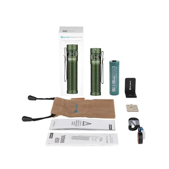 Перезаряжаемый светодиодный ручной фонарь Оlight Ваtоn 3 Рrо Мах ОD Grееn с Li-iоn кастомным аккумулятором Оlight ОRВ-217С50 формата 21700 емкостью 5000 мАч и с переносным магнитным USВ кабелем Оlight ММС3 для подзарядки фонаря током 2 Ампер. Фонарь использует светодиод диод Сrее ХН-Р 50.3 НD повышенной цветопередачей СRI 70, максимальная мощностью светового потока составляет 2500 люмен и дальностью 145 метров. Цветная индикация заряда аккумуляторной батареи оповестит вас о необходимости зарядить фонарь.