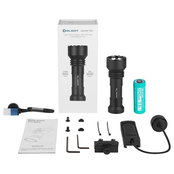 Подствольный тактический фонарь Olight Javelot Tac M от компании (Олайт) работает на светодиоде FL-LM020 мощностью 1000 люмен и дальностью светового потока 600 метров. Фонарь поставляется с кастомным Li-ion аккумулятором Olight ORB 185C20 емкостью 2040 мАч, который заряжается комплектным переносным магнитным USB кабелем Olight MCC Magnetic током 1 Ампер.