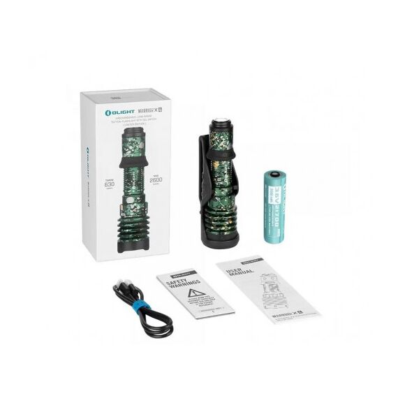 • Питание: 1 x Li-ion 21700 3,7 В. (Olight ORB-217C50 5000 мАч Samsung в комплекте 15 Ампер).