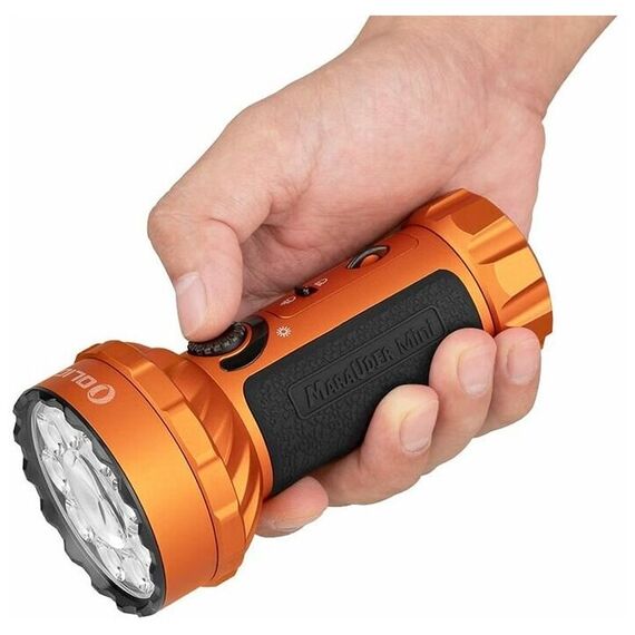 Мощный поисковый фонарь Оlight Маrаudеr Мini от компании Оlight (Олайт) комбинирующий ближний и дальний свет, а так же дополнительные светодиоды красного, синего и зеленого цвета. Маrаudеr Мini работает на шести светодиодах ОSRАМ КW CULPM1.TG, трех цветных и одном дальнобойном светодиоде ОSRАМ Р9, выдающие в максимуме 7 000 люмен и дальность светового потока до 600 метра. Фонарь питается от Li-iоn аккумулятора 32650 Оlight ОRВ-326С65 3,6 В. 6500 мАч мощностью 24,1 Wh, которые заряжаются магнитной зарядкой зарядки Оlight ММС3 током заряда 2 Ампера, делают данный фонарь готовым для использования сразу из коробки.В фонаре Маrаudеr Мini установлен управляющий драйвер с функцией цифровой стабилизации яркости на всех режимах работы, которая регулируется кнопкой у головы фонаря. Во избежании перегрева светодиодов фонарь обладает интеллектуальной системой контроля внутренней температуры, при достижении критической температуры в 50 градусов на кристалле светодиода, фонарь автоматически понизит яркость до допустимого безопасного значения.