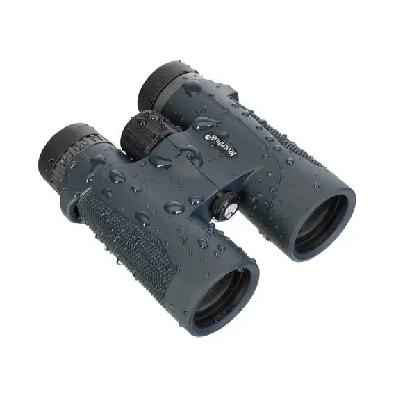 Бинокль полностью защищен от воздействия пыли, воды, песка, снега и грязи – в этом помогает герметизация корпуса, соответствующая стандарту IP67. Корректной работе прибора не помешают никакие осадки, а также прямое погружение в воду на глубину до 1 метра. Бинокль не подвержен распространенной проблеме запотевания оптики при скачках внешней температуры, поскольку внутри его корпус заполнен азотом. Переноска Levenhuk New Karma PLUS 10x42 в руках, походном рюкзаке или сумке происходит с комфортом – бинокль имеет относительно небольшие размеры из-за использованных в конструкции roof-призм. Снаружи корпус прибора имеет обрезиненное покрытие, а значит, его будет удобно удерживать и сухими, и мокрыми руками.
